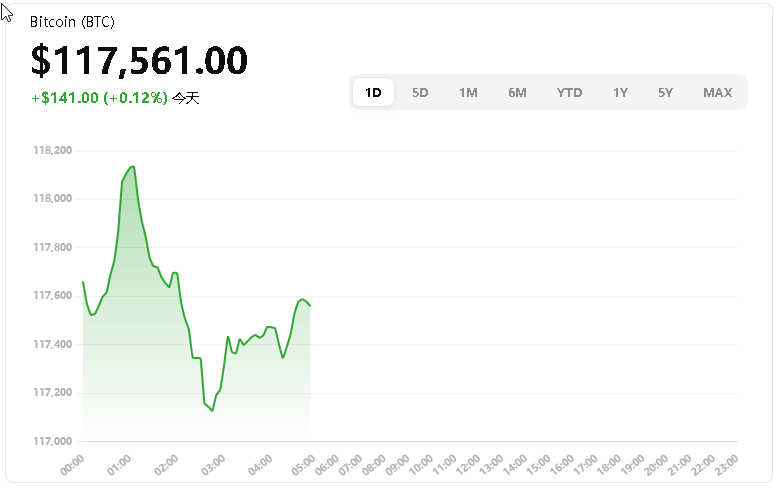 目前价格约 $117,560,较昨日略微回升 (+0.12%),但整体仍处于 $115k–$120k 的高位震荡区间。