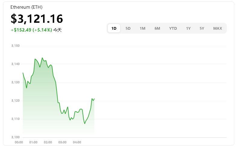 实时价格约 $3,121,日内涨幅 +5.1%,突破心理关口 $3,100,高点上探至 $3,143。