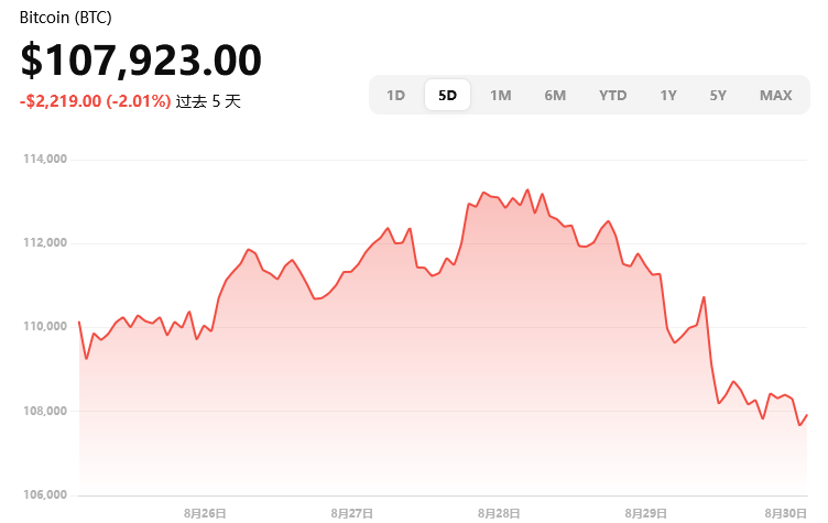 当前比特币价格约 $107,923,日内下跌约 3.18%,盘中高点约 $111,831,低位触及 $107,492。