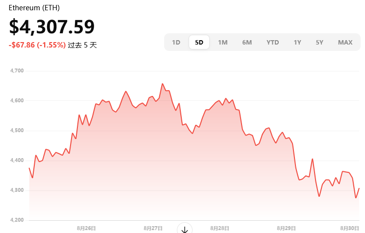 当前以太坊价格约 $4,307.59,日内下跌约 3.87%,盘中高点约 $4,503,低位约 $4,267。