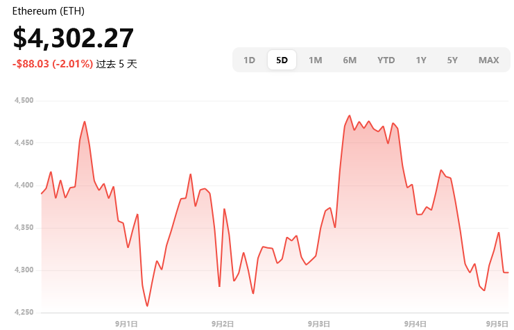 当前行情:以太坊报约 $4,302,较昨日下跌约 3.7%,日内区间在 $4,269–$4,473 。